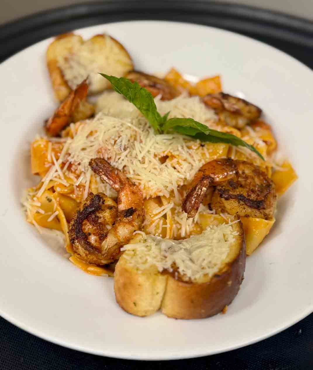 Blackened shrimp over pappardelle in a creamy pink vodka sauce