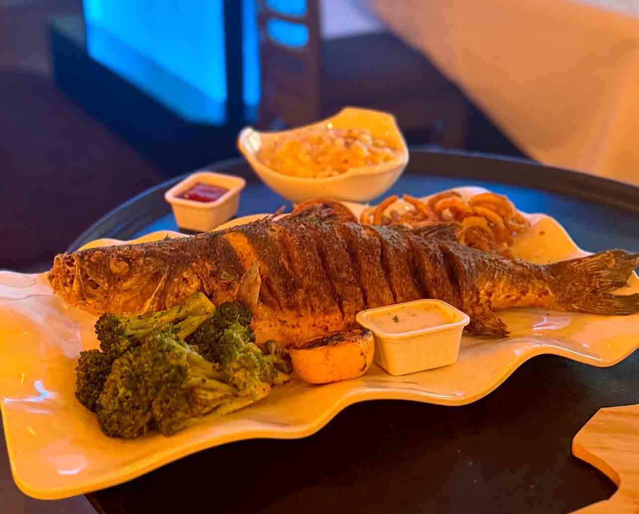 Crispy whole Mediterranean seabass, flash fried, served with charred broccoli and fries